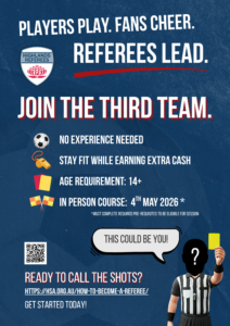 Highlands Soccer Association is calling on players, parents, supporters, and community members to step up and become part of the third team on the field — our referees.